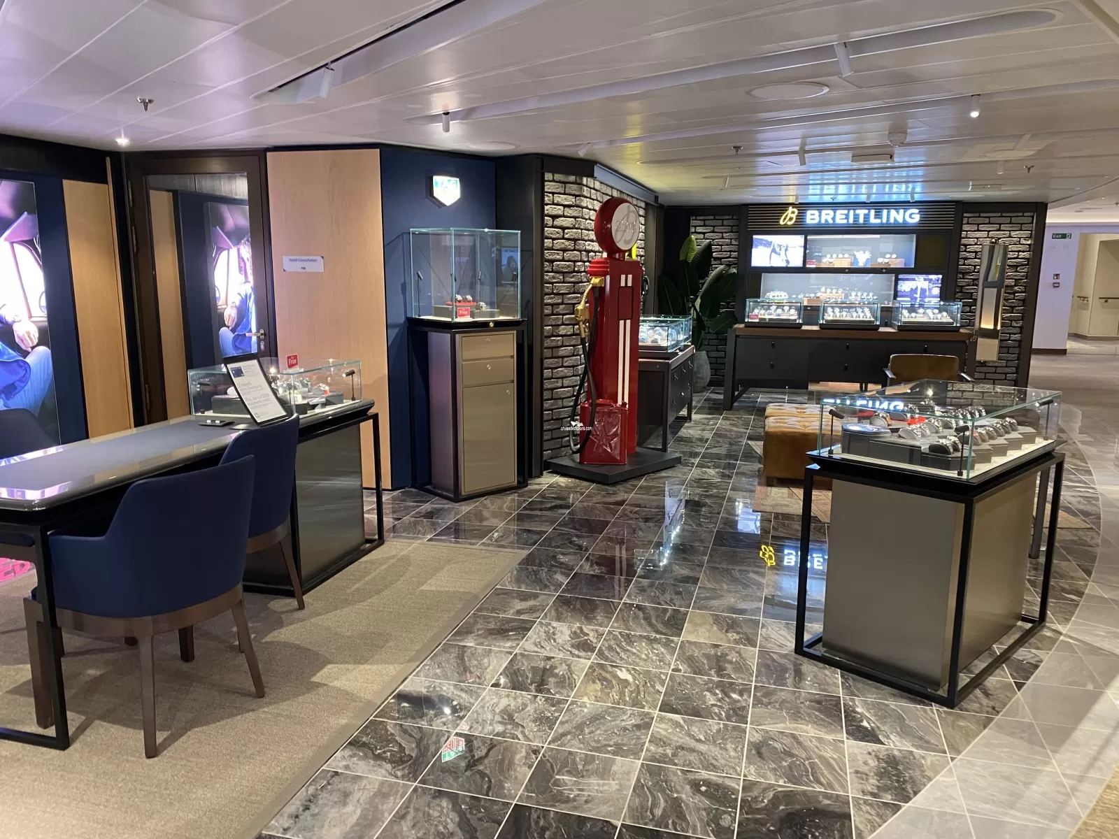 The high quality design coupled with an intuitive and well laid out flow allows the Queen Anne guest to really get an immersive shopping offering across many different product categories seamlessly offered together. The boutiques are really nicely positioned wrapped around the Queen's Room on Deck 3 with a well located welcoming positioning allowing a good deal of both passing guest foot flow but also increased dwell time from the curiosity factor being next to the Queen's Room. With nice features such as the Experience Lounge and the Cabinet of Curiosities perfectly designed to accompany the adjacent space, alongside some excellent brand expositions, this is a really strong retail offering from the team at Harding+ and perfectly captures what an elevated reimagined Cunard retail experience should be.